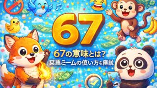 英語ミーム 67(シックスセブン) の意味とは?英語ミームの使い方を解説 67 の意味、使い方、元ネタをわかりやすく解説します。SNSやネットミームでの使われ方も紹介。 2026.03.19 ネット用語英語ミーム