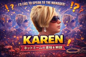 karen の意味、使い方、元ネタをわかりやすく解説します。SNSやネットミームで話題になる「理不尽なクレーマー」を指すスラングの由来と使用例を紹介。