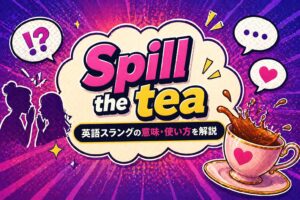 ネット用語 Spill the tea とは?「噂話をする」を表す英語スラングの意味・使い方を解説 Spill the tea の意味、使い方、元ネタをわかりやすく解説します。SNSやネットミームでの使われ方、ニュアンスも紹介。「お茶をこぼす」だけじゃない、ゴシップを共有するスラングです。 2026.04.17 スラングネット用語